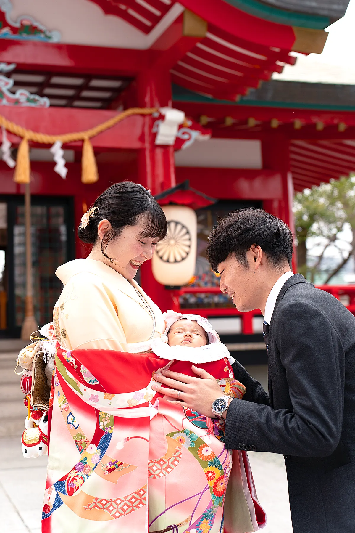 このプランには産着やベビードレスのレンタルも含まれていますので、スタジオでのフォーマルな撮影、さらに神社での屋外撮影まですべてを1日で行うことができます。