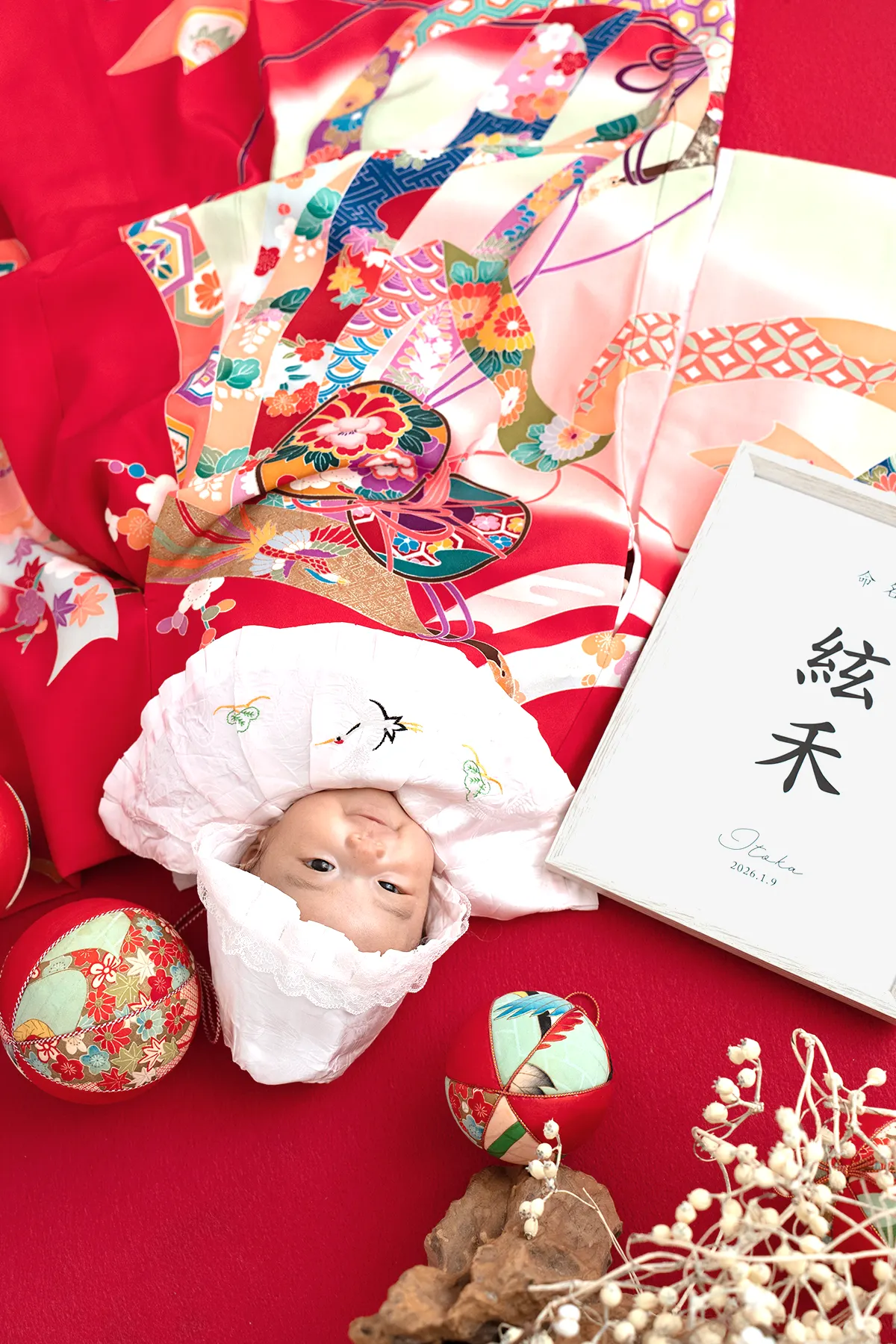 スタジオ撮影では当店オリジナルデザインの命名書と一緒に撮影ができます♡