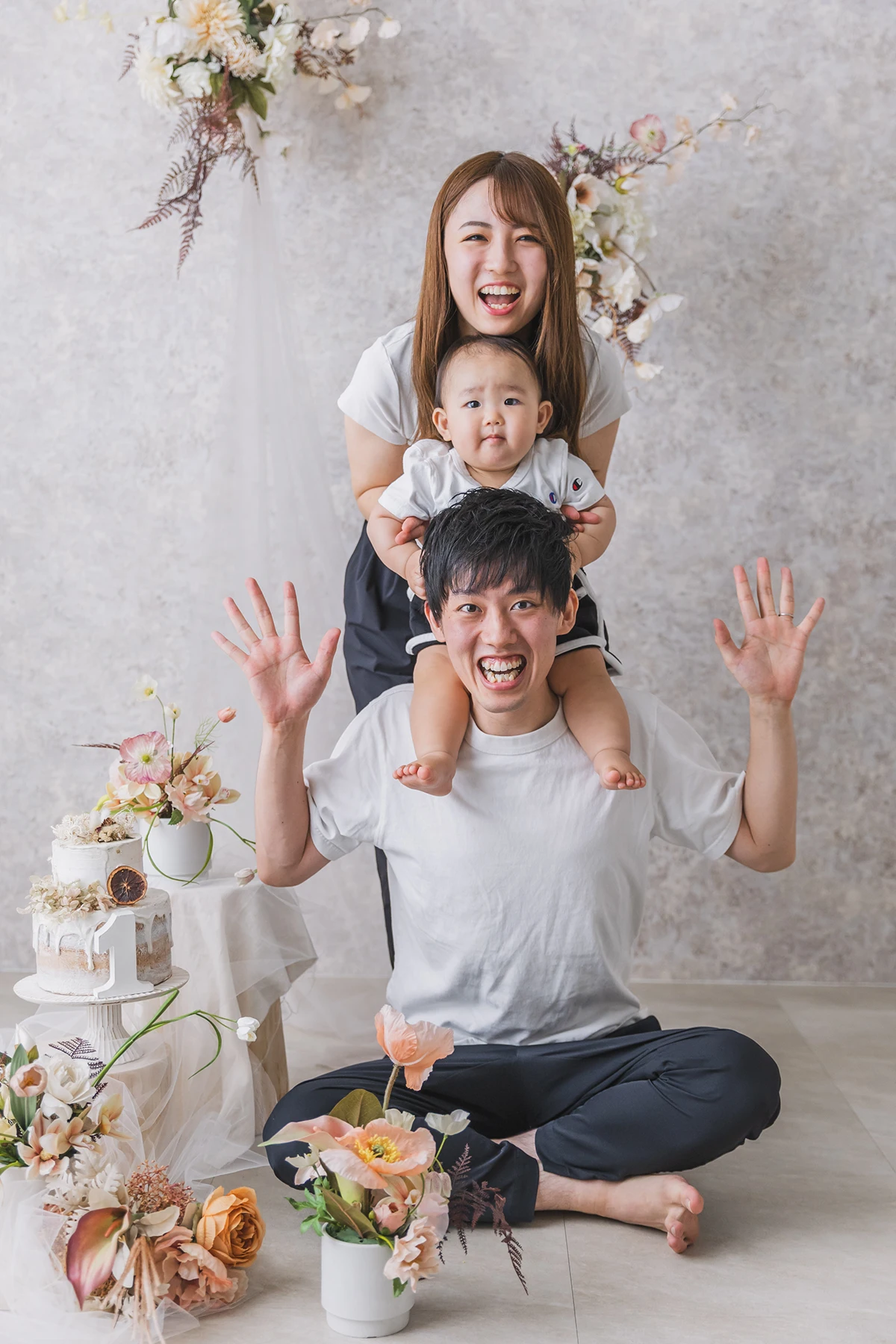 1歳のお誕生日祝いにスマッシュケーキを持ち込んで撮影したい方はこちら!主役のお子様のソロショットをメインに、お時間内で家族写真も撮影できるバースデープランです♡
